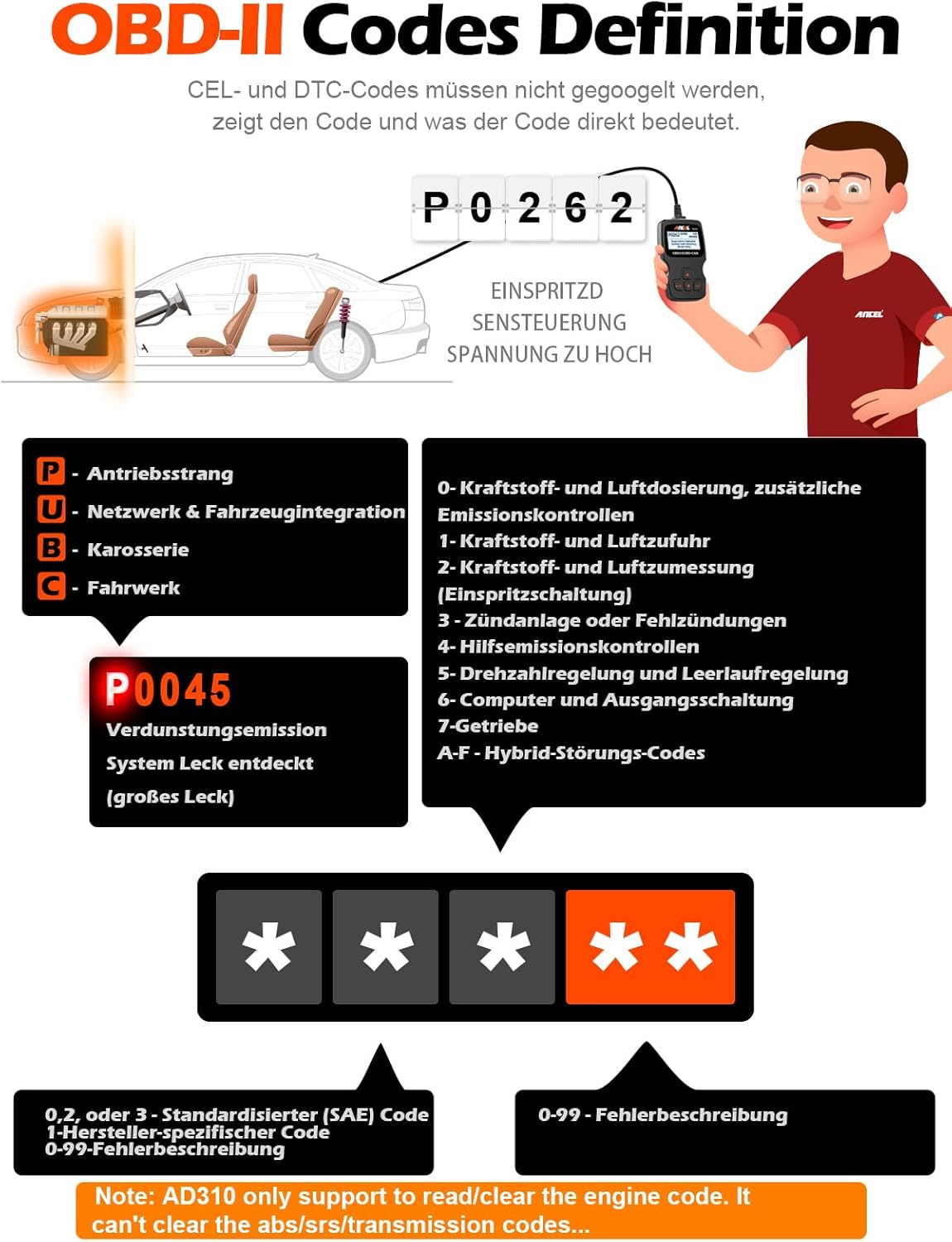 【Warm Tip】ABS/Airbag/SRS Codes NOT Supported, AD310 just supports the engine system diagnosis.